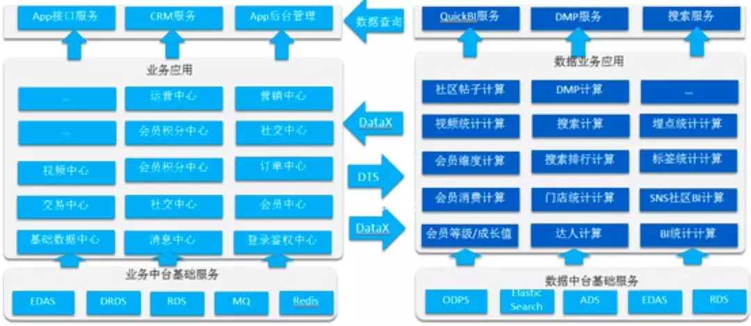 業(yè)務(wù)中臺和數(shù)據(jù)中臺都是阿里巴巴首先推出中臺理念的代表性產(chǎn)品,業(yè)務(wù)中臺打破了傳統(tǒng)的煙囪式的業(yè)務(wù)系統(tǒng)開發(fā)框架,”采用阿里巴巴的數(shù)據(jù)中臺+業(yè)務(wù)中臺雙中臺設(shè)計(jì),采用企業(yè)級的業(yè)務(wù)協(xié)同,阿里內(nèi)部25個(gè)事業(yè)部300+業(yè)務(wù)單元,把煙囪架構(gòu)到統(tǒng)一微服務(wù)平臺,從1000+系統(tǒng)到數(shù)十個(gè)商業(yè)能力敏捷創(chuàng)新,實(shí)際檢驗(yàn)阿里在4周搭建盒馬業(yè)務(wù)框架,實(shí)現(xiàn)了秒級數(shù)據(jù)智能,數(shù)據(jù)從采集、建構(gòu)、展現(xiàn)只要2.5秒”, 行顛在2019年阿里云上海峰會的詮釋非常精準(zhǔn)的說明了數(shù)據(jù)中臺與業(yè)務(wù)中臺的關(guān)系。