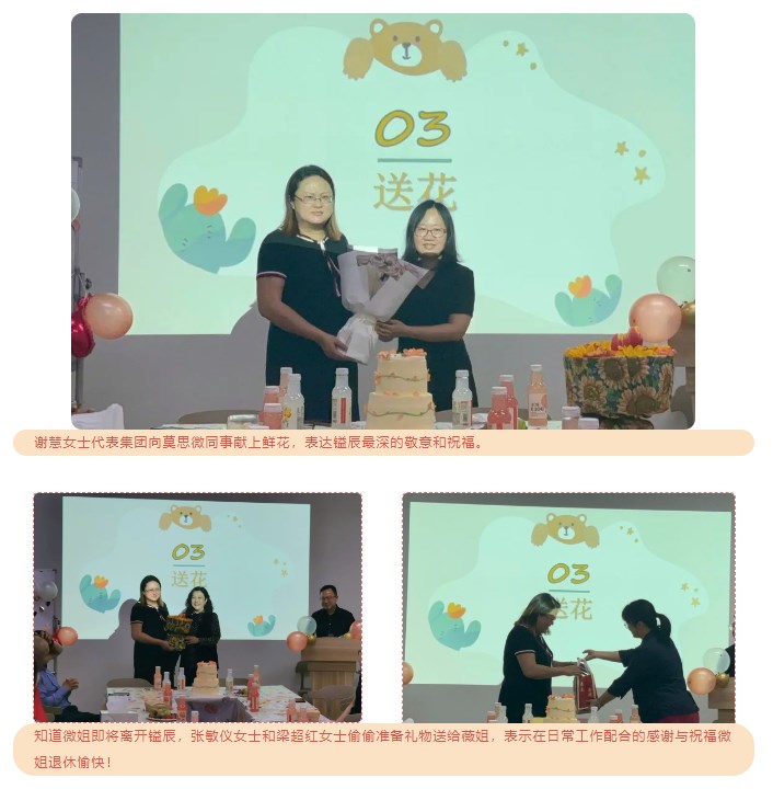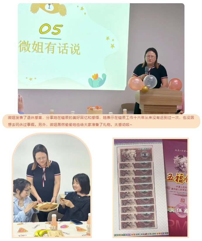 感謝莫思微同事的付出和努力、陪伴和堅(jiān)守。雖然她即將離開(kāi)鎰辰,但她的精神和品質(zhì)將永遠(yuǎn)留在鎰辰心中。最后,再次為莫思微同事送上真摯的祝福:愿您退休后的生活充滿歡樂(lè)與安寧,享受每一刻的美好時(shí)光!
